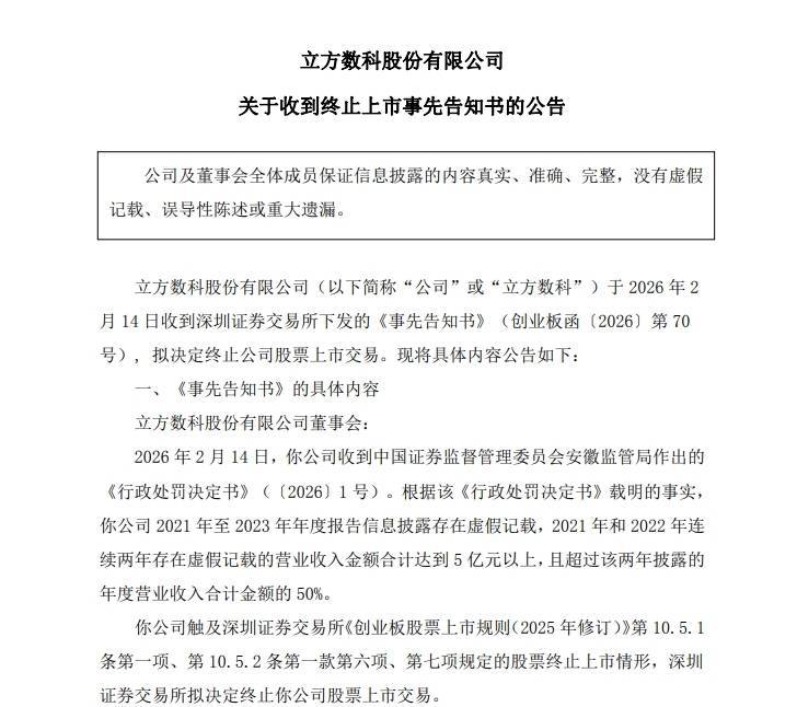 2月14日晚间,*ST立方公告称,公司于2月14日收到深圳证券交游所下发的《事前见告书》,拟决定闭幕公司股票上市交游,公司股票将于2月24日起停牌。见告书指出,公司2021年至2023年年度陈诉信息袒露存在作假记录,2021年和2022年连络两年存在作假记录的营业收入金额揣度达到5亿元以上,且朝上该两年袒露的年度营业收入揣度金额的50%。