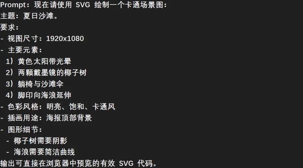 而在SVG卡通场景绘图的场景中,智东西条件三款模子输出“阳光沙滩”的SVG卡通图,对尺寸、主题、元素、作风和细节条件具体,三款模子在复杂拘谨下输出的SVG基本结构廓清,但太阳、浪潮、遮阳伞、椰子树等物体的迫临经过仍推崇不及。