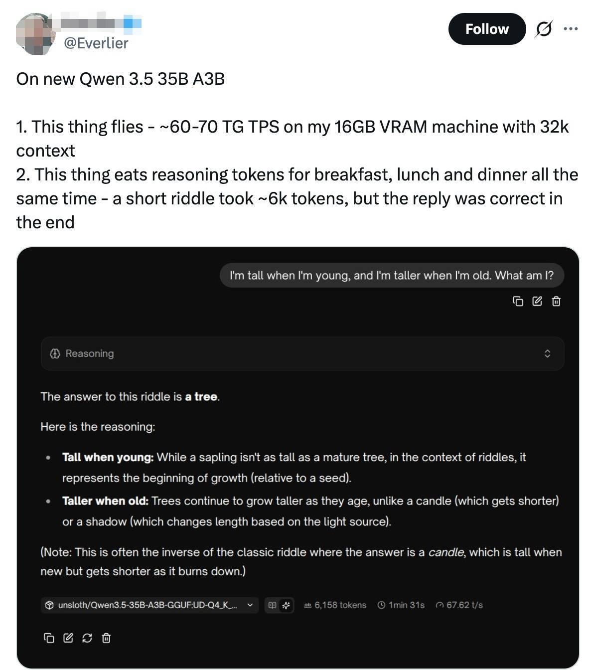 一位成就者共享了其部署Qwen3.5-35B-A3B的情况,称模子可以跑在16GB的显存机器上,处理32k荆棘文时,每秒处理数能达到60-70个任务;但他也提到,模子吞token的速率惊东谈主,一个短谜题就用了大要6k token,但最终谜底是正确的。