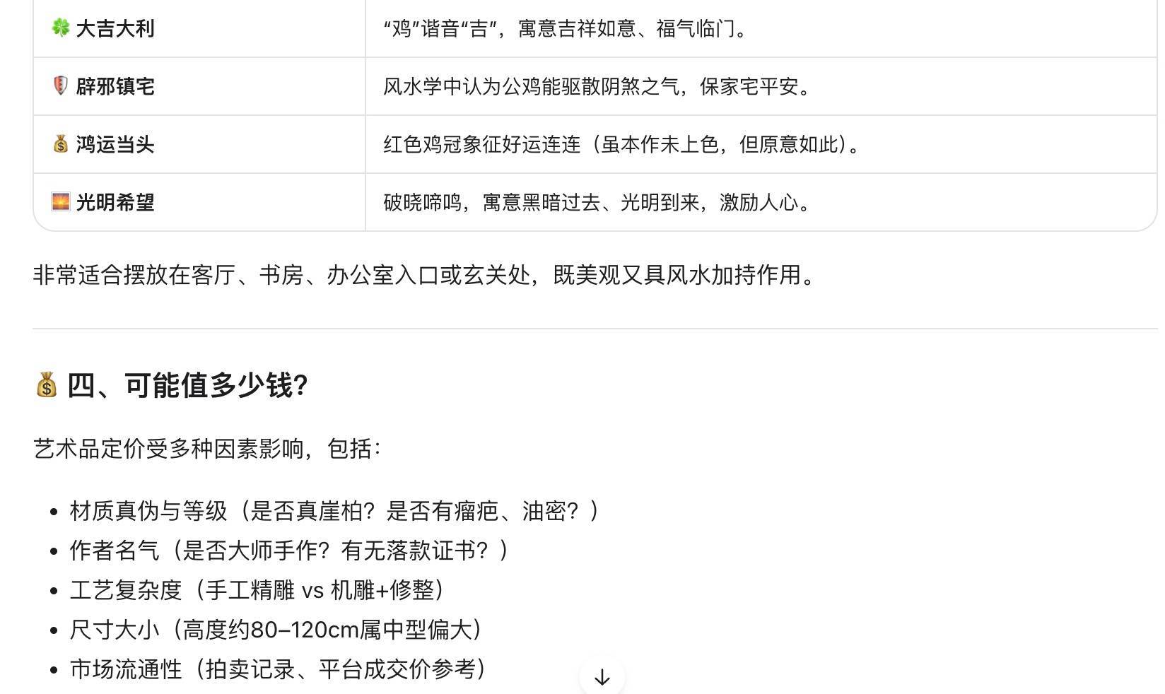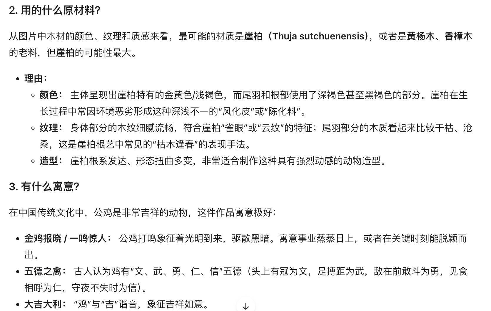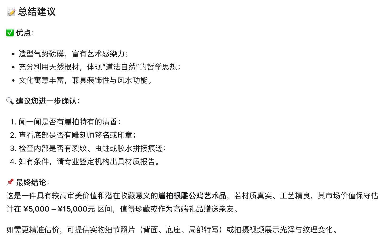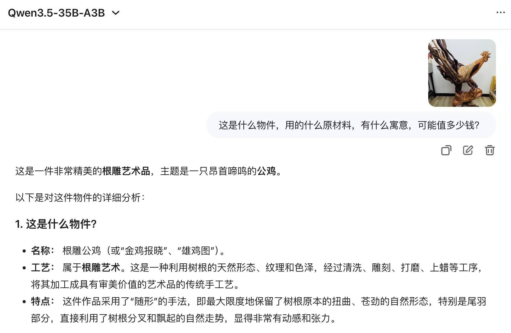 比如当我上传一张“公鸡根雕”的图片,三款模子都能够准确识别其为根雕艺术品,能够说明神色和纹理准确识别材料为“崖柏”,能结合中国传统文化解读这一物件的意旨,以致能基于材质、工艺水平、尺寸大小等要素进行价钱评估,评估收尾基本相宜这一畛域的专科水平,令东谈主很惊喜。