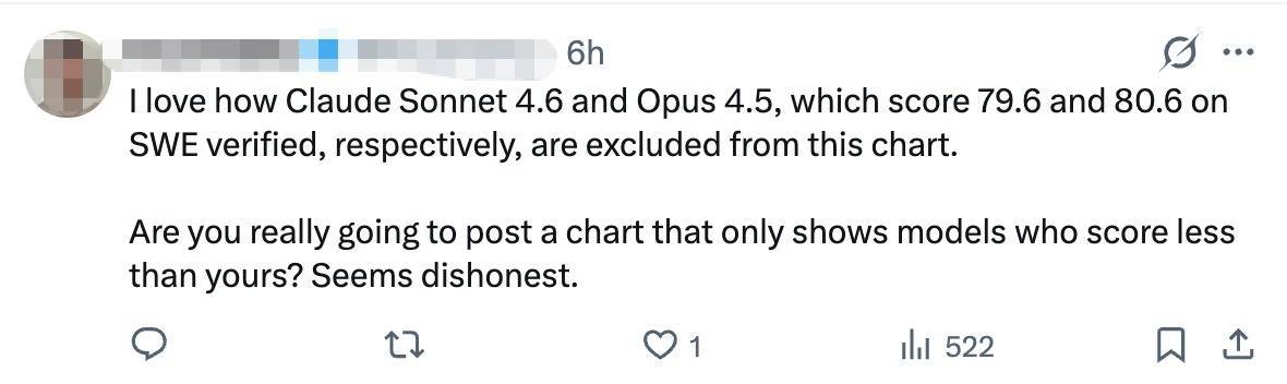 不外也有网友抒发了更高的期待:“我真搞不懂为什么这张图表(测评图表)里莫得Claude Sonnet 4.6和Opus 4.5这两款在SWE认证评分等诀别高达79.6分和80.6分的机型。”