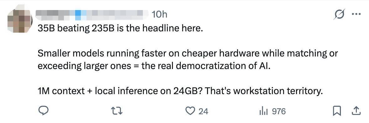 模子也曾发布在成就者圈引起和蔼。多位成就者称这些模子尺寸是土产货推理的绝佳选拔,奖饰其“更小模子终了更强性能”,以致有东谈主称Qwen3.5-35B-A3B有望将其每月破耗从2000欧元(购买Gemini奇迹)降至50欧元,大大从简本钱。