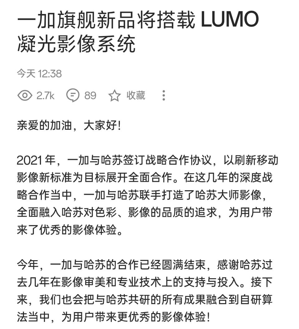 今天一加官刚直式官宣,早在 2021 年与哈苏缔结的战术合营,本年认真圆满甩掉。