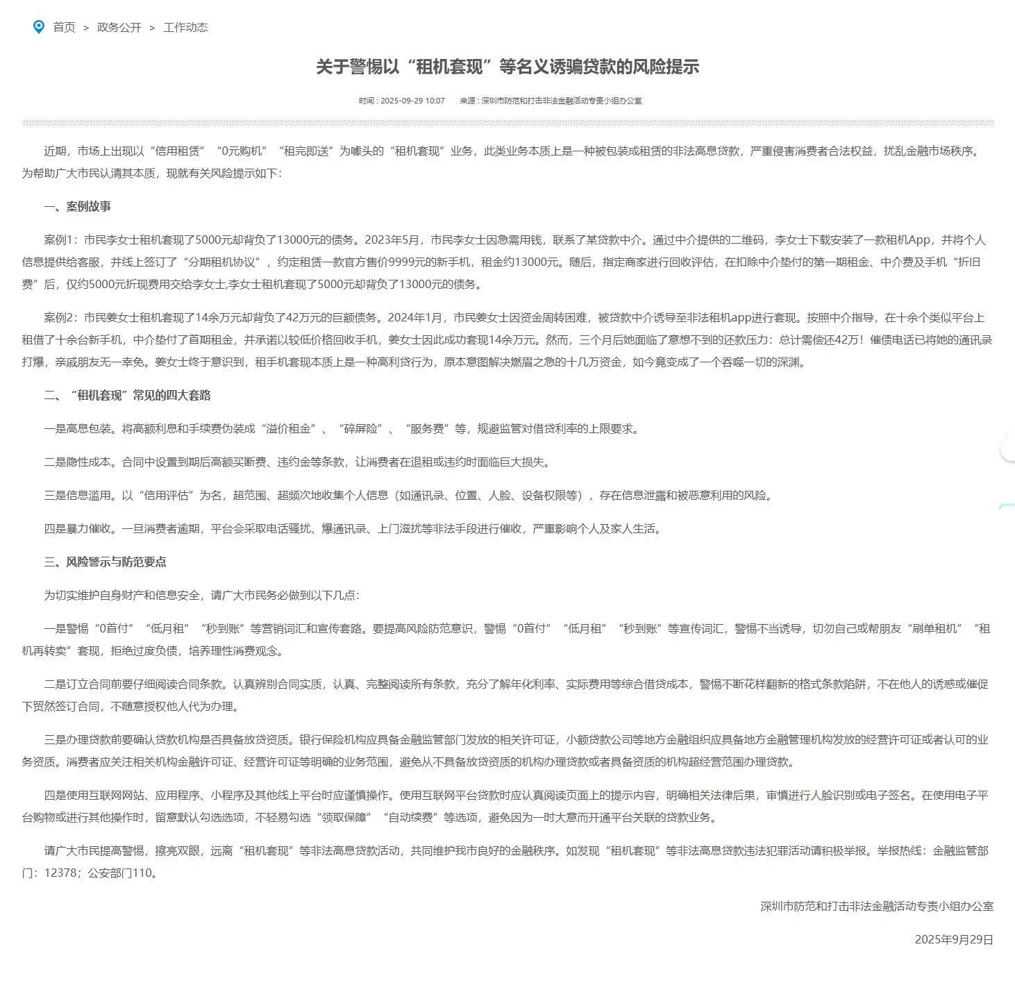 r请普遍市民普及警惕,擦亮双眼,隔离“租机套现”等违规高息贷款步履,共同珍爱深圳市讲究的金融治安。如发现“租机套现”等违规高息贷款犯法犯法步履请积极举报。举报热线:金融监管部门:12378;公安部门110。