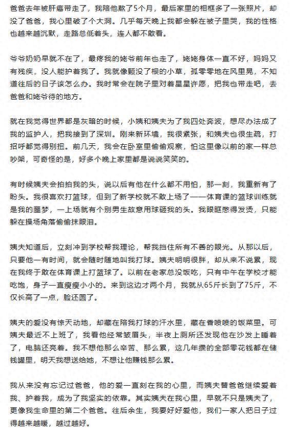 让东谈主泪标的不是“第二个爸爸”,而是“我被爱了”佳佳写:“我心里破了个大洞,像没根的小草。”可她又说:“姨父给了我一个家,他是我的第二个爸爸。”这话让全网看哭,是因为真。真在危一鸳侣收养她的决定,真在佳佳砸碎存钱罐拿出1321.6元说“守旧爸爸创业”的举动,更真在危一那句跟浮光掠影却重如千钧的“妻子的娘家有难处,鸳侣就该相互扶抓”。咱们总说家是港湾,可港湾的锚,不在户口本上,也不在血统里,而在鸳侣俩并肩濒临风雨时,相互眼里的那份将强。佳佳那篇作文,最动东谈主的不是“我被收养了”,而是“我被爱了”。她从山东到深圳,从自卑到敢打篮球、敢交一又友,从“没根的小草”酿成有家的孩子,靠的不是血统,是年复一年的奉陪、忌辣的饭菜、被打时有东谈主露面的安全感。而这一切的起始,是危一和他妻子那句没说出口的共鸣——“咱们是一伙的。”网友纷纷点赞